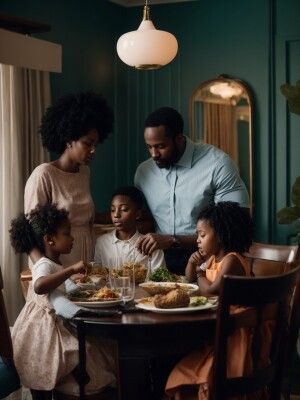 «A black man and his Black Family Having Dinner at Dining Room ta...»