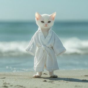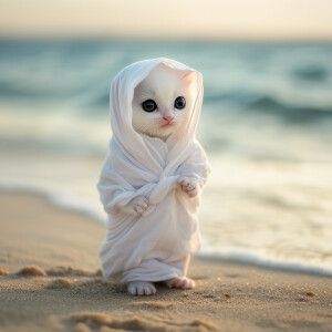 «A white kitten with black eyes wearing a white robe wearing sand...»