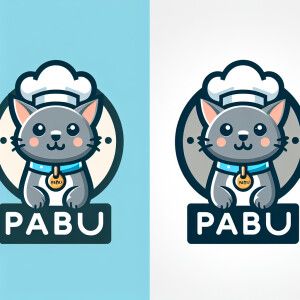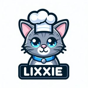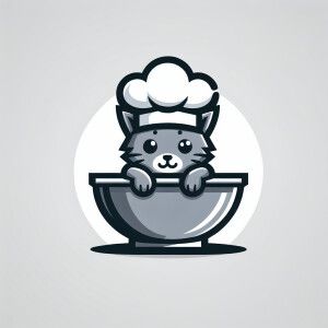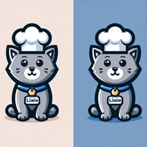 «A gray puppy with green eyes with a chef hat on its head wearing...»