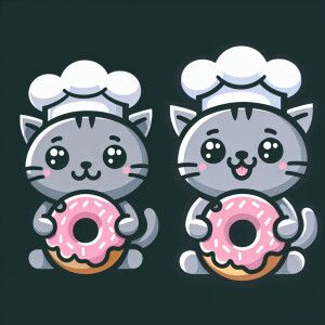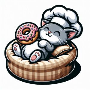 «A gray kitten with a chef hat on its head eating a donut on a ca...»