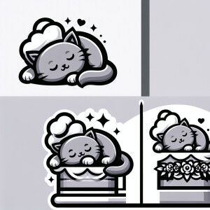 «A gray kitten with a chef hat on its head sleeping on a wedding...»