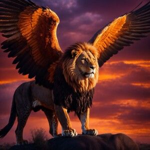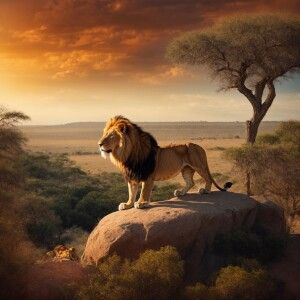 «"Illustrate a serene scene where a lion lounges on a rock outcro...»