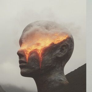 «Surrealist humanoid, contrasting textures and elements, fire and...»