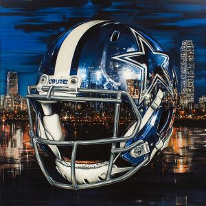 «Dallas Cowboys helmet, Dallas skyline behind the helmet.»