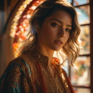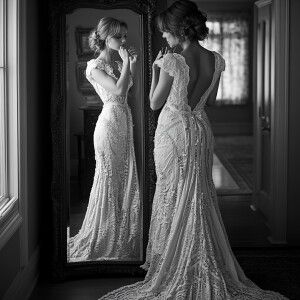 «Create an image of a breathtakingly beautiful woman admiring her...»