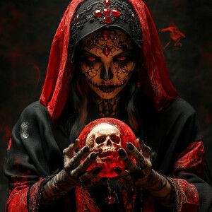 «A reaper lady with a tattooed face and body. Skin with jewels an...»