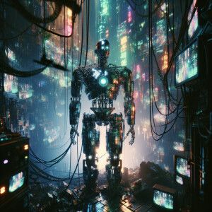 «In the glitchy retro-futuristic dreamscape, flickering neon ligh...»