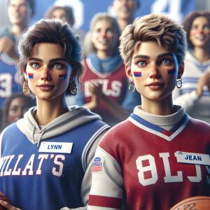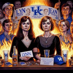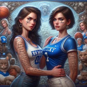 «Create an image of two women accompanying the Kentucky Wildcats....»