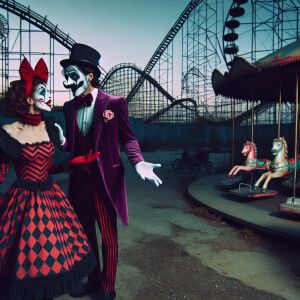 «Create an image that captures a theatrical scene between Harley...»
