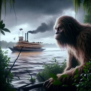 «A humanoid, hairy Sasquatch gazing at a passing riverboat on the...»