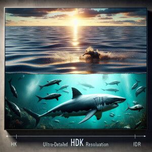 «Half-submerged split-view of a great white shark pursuing a seal...»
