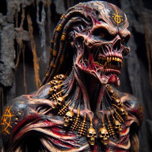 «A grotesque zombie alien with tattered crimson, ebony, and golde...»