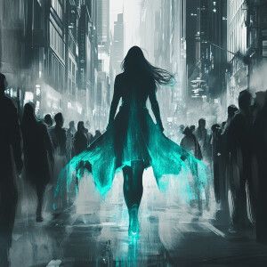 «A crowd huddles on the monochrome street, their attention fixed...»