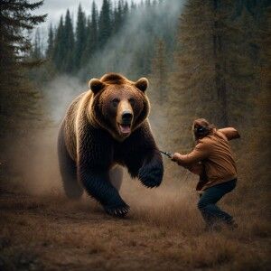 «A grizzly bear fiercely attacking a humanoid looking Bigfoot cov...»