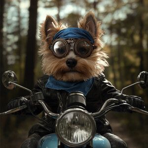 «An hyper-realistic image of a yorkie riding a blue metallic moto...»