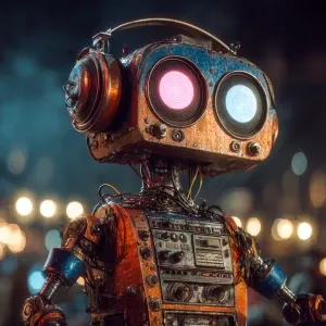 «Retro-futuristic robot DJ with wires and circuits exposed, vibra...»