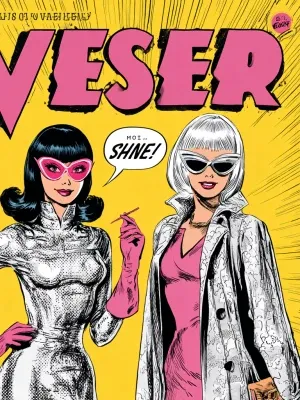 «1960s retro comic book cover, a bold yellow burst background, tw...»
