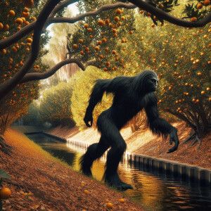 «A black humanoid looking Bigfoot chased up a tall orange tree in...»