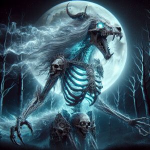 «An eerie ghostly alien skeleton figure with elongated fangs, sur...»