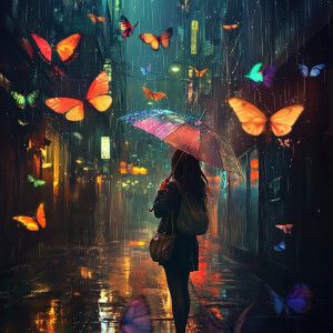 «A woman standing in a rain-soaked alley, her umbrella dissolving...»