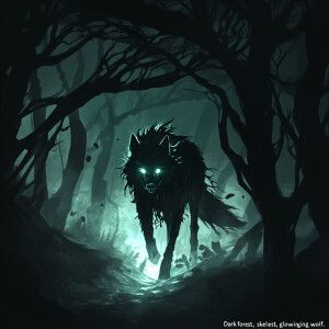 «"Dark forest, skeletal trees, glowing wolf."»