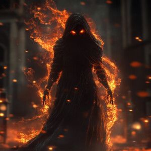 «A female Grim Reaper with flowing black robes and glowing red ey...»