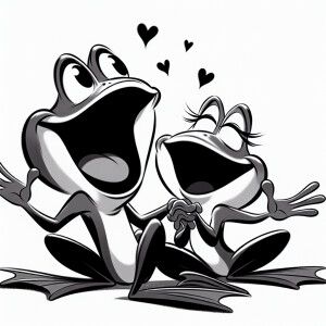 «1950s style vintage cartoon black and white, 2 frogs love each o...»