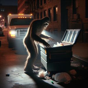 «Create an image depicting a humanoid Sasquatch rummaging through...»
