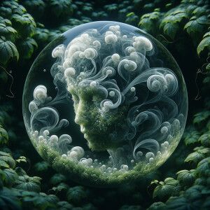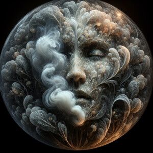 «A glass orb, inside glowing smoke in the shape of a face, overg...»