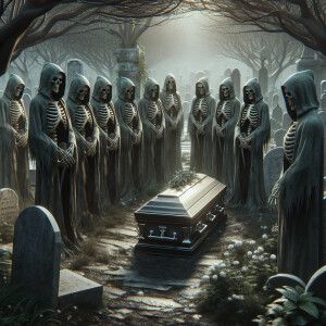 «A crowd of hooded skeleton,staring down at a casket in a Cemeter...»