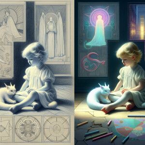 «Little girl sitting on the floor next to a dragon, a picture, by...»