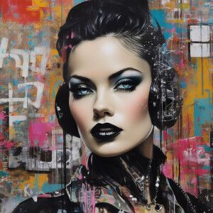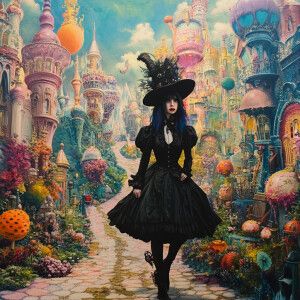 «Generate an image of a gothic woman in the midst of a brightly c...»