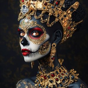 «An otherworldly Egyptian zombie queen adorned with elaborate jew...»