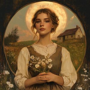 «Digital art portrait of a serene female in a vintage dress, hold...»