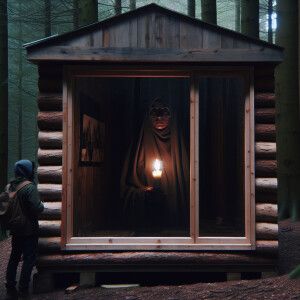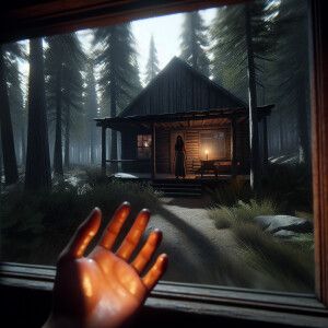 «Approaching a secluded log cabin nestled in a dense forest, I no...»