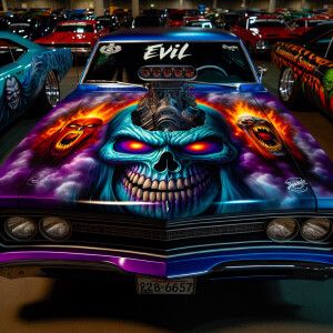 «A classic muscle car with a vibrant, multicolored paint job feat...»