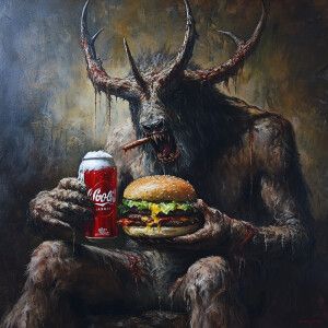 «Wendigo eating a big fat cheeseburger and drinking a cold coors...»