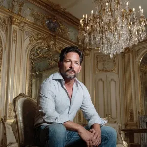 «A distinguished man with a dark beard stands confidently in an o...»