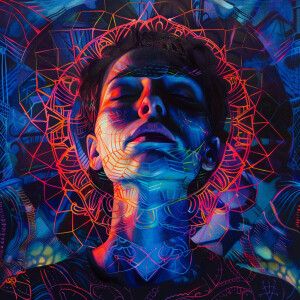 «A woman’s face framed by a glowing bioluminescent mandala in Cyb...»