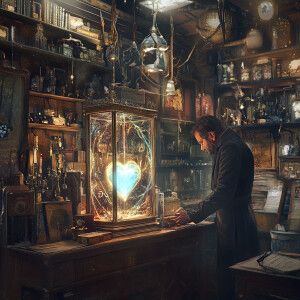 «Generate a dusty, dimly-lit antique shop with shelves cluttered...»
