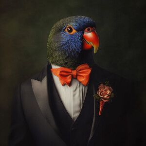 «Photorealistic image. Lorikeet bird in a tuxedo»