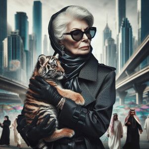 «An elderly woman, cloaked in a sleek black trench coat and donni...»
