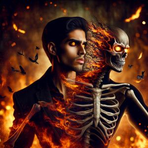 «A haunting scene of a black and red human undergoing a dramatic...»