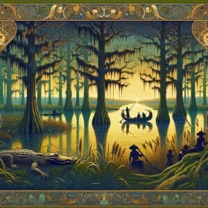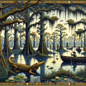 «Visualize a scene reminiscent of the lush swamps of Louisiana as...»