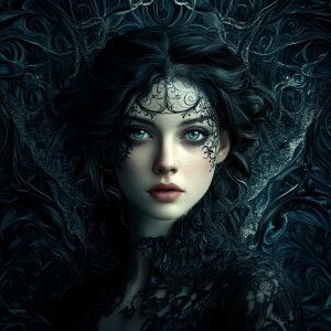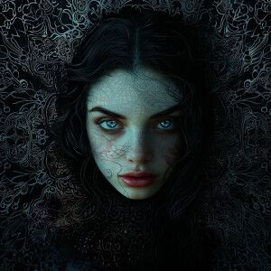 «A straight-on portrait of a woman, framed by a glowing fractal p...»