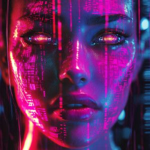 «A woman’s face, illuminated by neon lights, with a fractal-patte...»