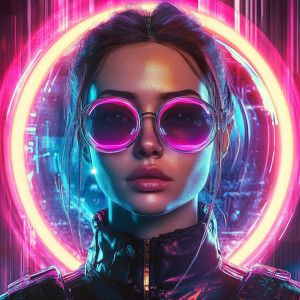 «A straight-on, eye-level Cyberpunk digital portrait of a woman,...»