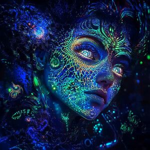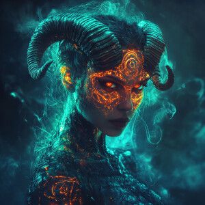 «Create an image of a bioluminescent, Aries-themed female figure...»