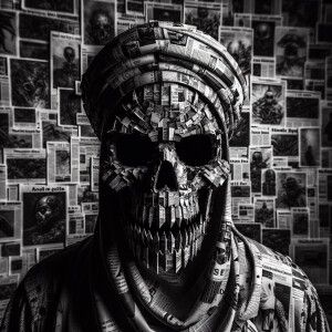 «Image is a highly stylized and dramatic portrait of a person wea...»