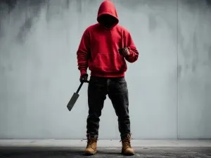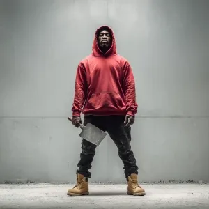 «Cinematic full-body portrait of a hooded street artist standing...»